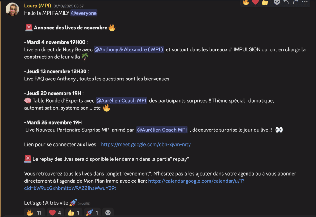 Ils vous donneront accès à un groupe privé discord avec un accès à tous le réseau de participants (+ de 100 participants), de professionnels (notaires, directeurs de banques …) ainsi qu’à des live hebdomadaires avec Alexandre et Anthony pour répondre à toutes les questions de la communauté.