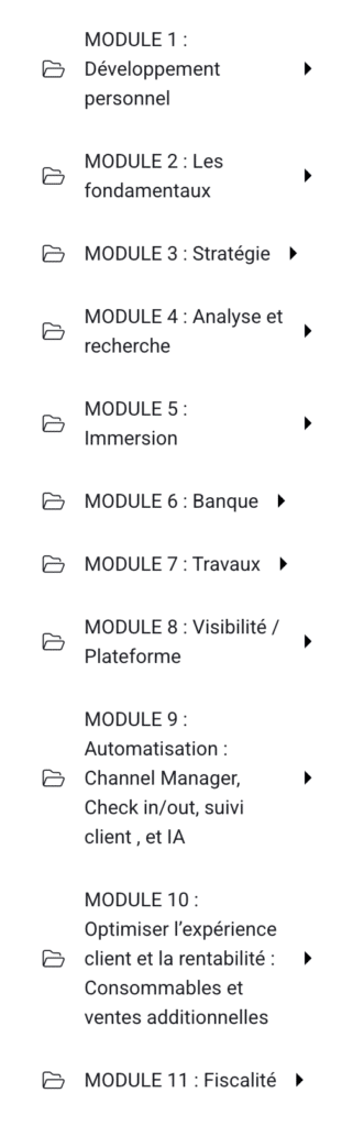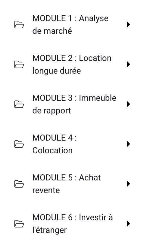La liste n’est pas exhaustive par parties, le but est que vous compreniez rapidement l’objectif de chacun et ce que vous pourrez apprendre. Vous pourrez ensuite approfondir le contenu des différents modules lors de votre appel avec Mon Plan Immo.
