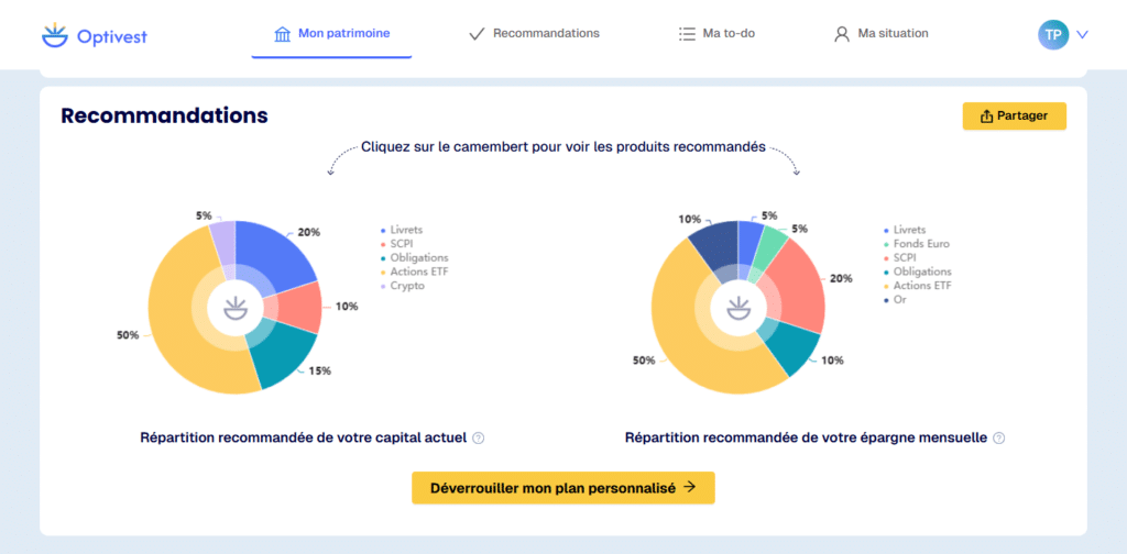 Vous avez accès à la to-do list, à l’allocation d’actifs et aux recommandations. En revanche, vous n’avez pas accès au nom des produits : vous devrez donc les chercher vous-même.