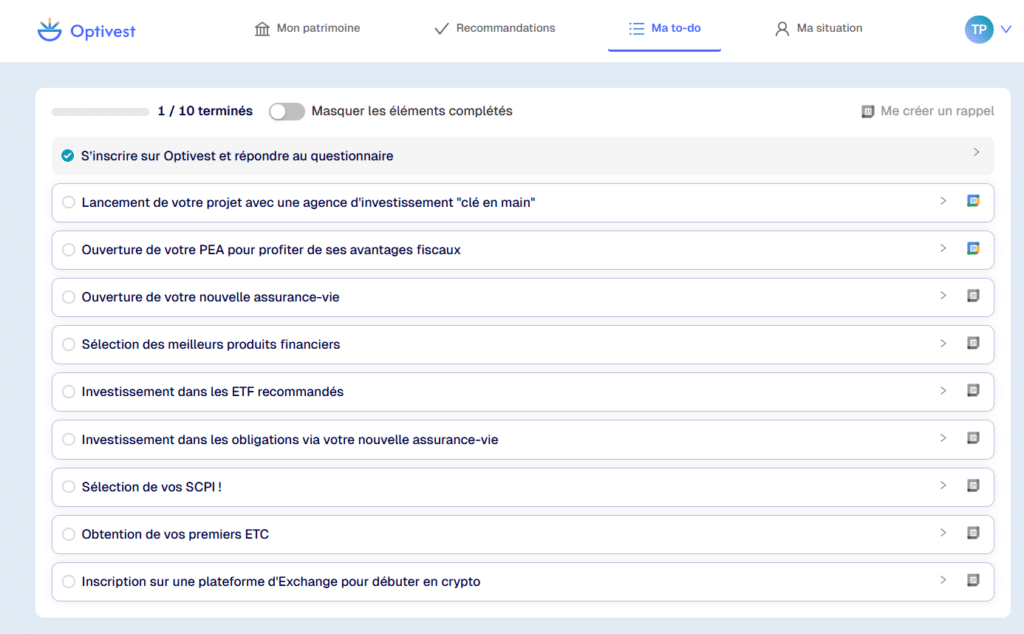 une to-do list des actions à mettre en place pour construire un patrimoine solide, aligné avec vos objectifs.