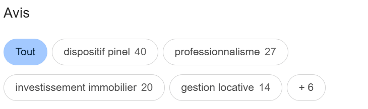 Les avis clients mentionnent majoritairement des investissements immobiliers (les mots-clés les plus fréquents sur Google le confirment, comme montré dans l’image ci-dessus).